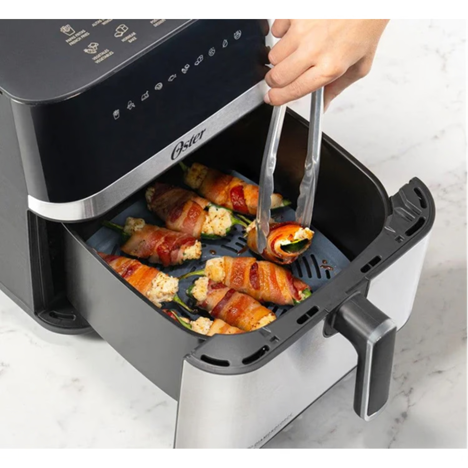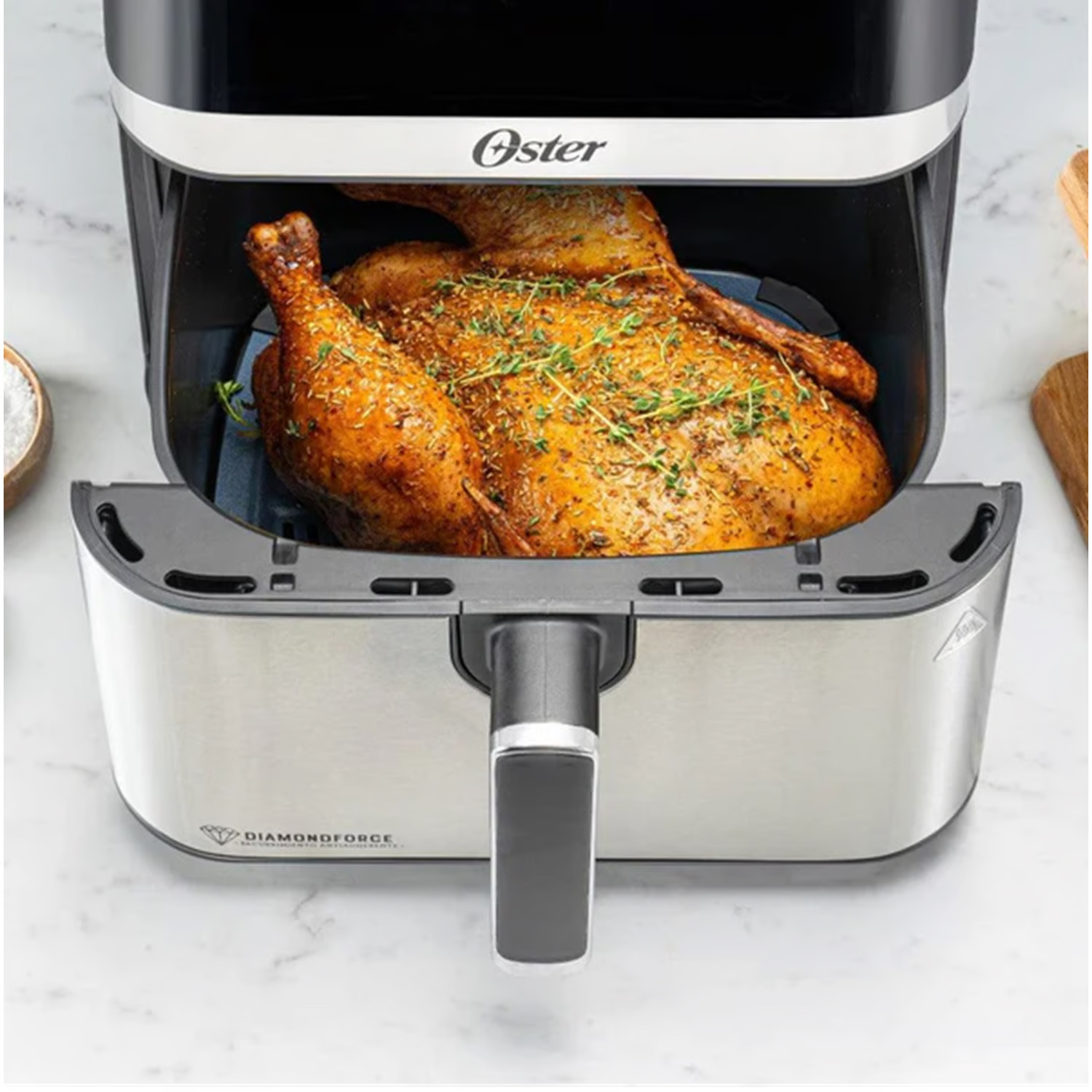 Transforma tu experiencia culinaria con nuestra freidora de aire digital Oster® de última generación. Con nuestro recubrimiento Oster® DiamondForce, que es hasta 12 veces más resistente a rayaduras y hasta 15 veces más fácil de limpiar* que los recubrimientos convencionales, tu freidora se mantendrá en perfectas condiciones durante más tiempo. Su capacidad de 7.5L** permite cocinar un pollo de hasta 3.63Kg. Equipada con una ventana transparente y una luz interna, esta freidora te brinda una visión clara del proceso de cocción en cada paso del proceso. Con 10 Programas automáticos: Papas fritas, alitas, aves, carne, vegetales, pescado/mariscos, hornear, postre, deshidratar y calentar.