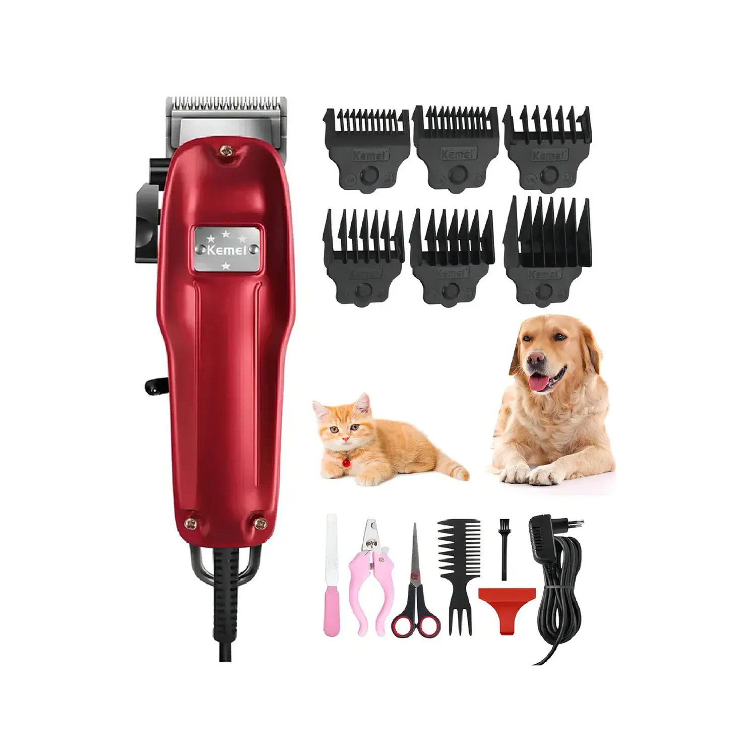 - El kit contiene: Máquina alámbrica (Con cable), 6 peines guía 1.5MM, 3MM, 4.5 MM, 6 MM, 10 MM, 16 MM, Lima de uñas, Cortauñas, Cepillo de limpieza de máquina, Peineta y Tijeras.